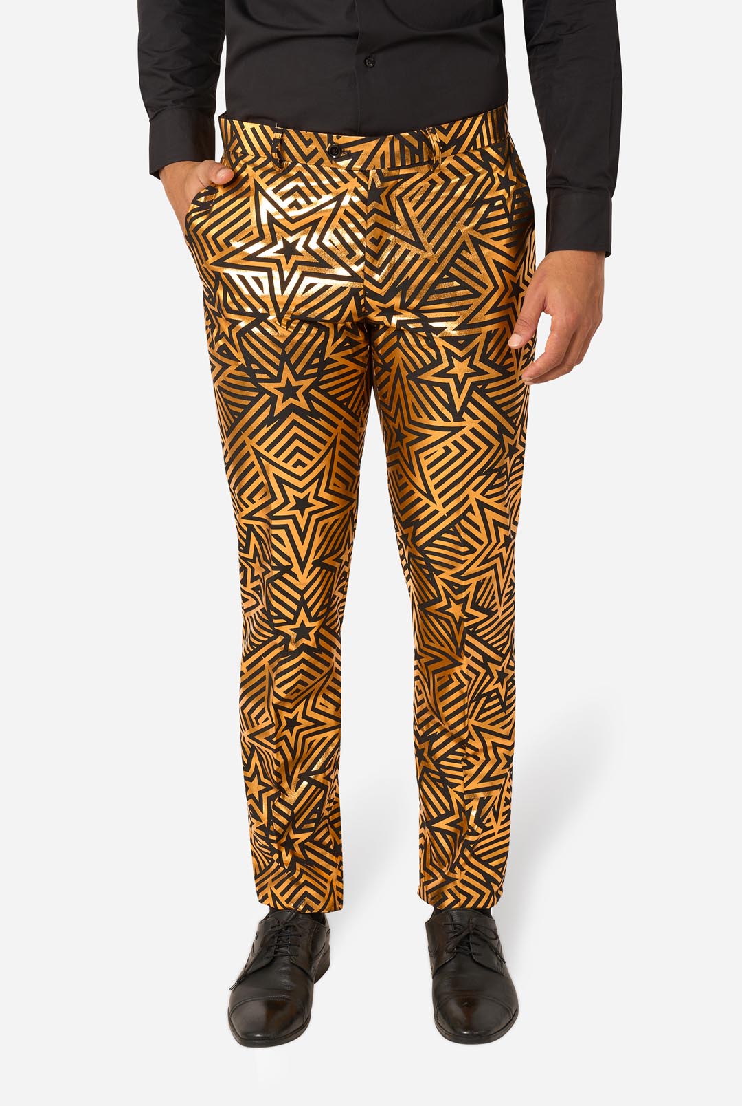 The Golden Geo Star is not an ordinary suit and it's not hard to see why. Radiating an aura of celestial glow, glamour and confidence, this piece rivals the Hollywood Walk Of Fame in shining stars. Dazzle your way through the crowd with this gold suit and be the center of the galaxy. The sky's the limit!