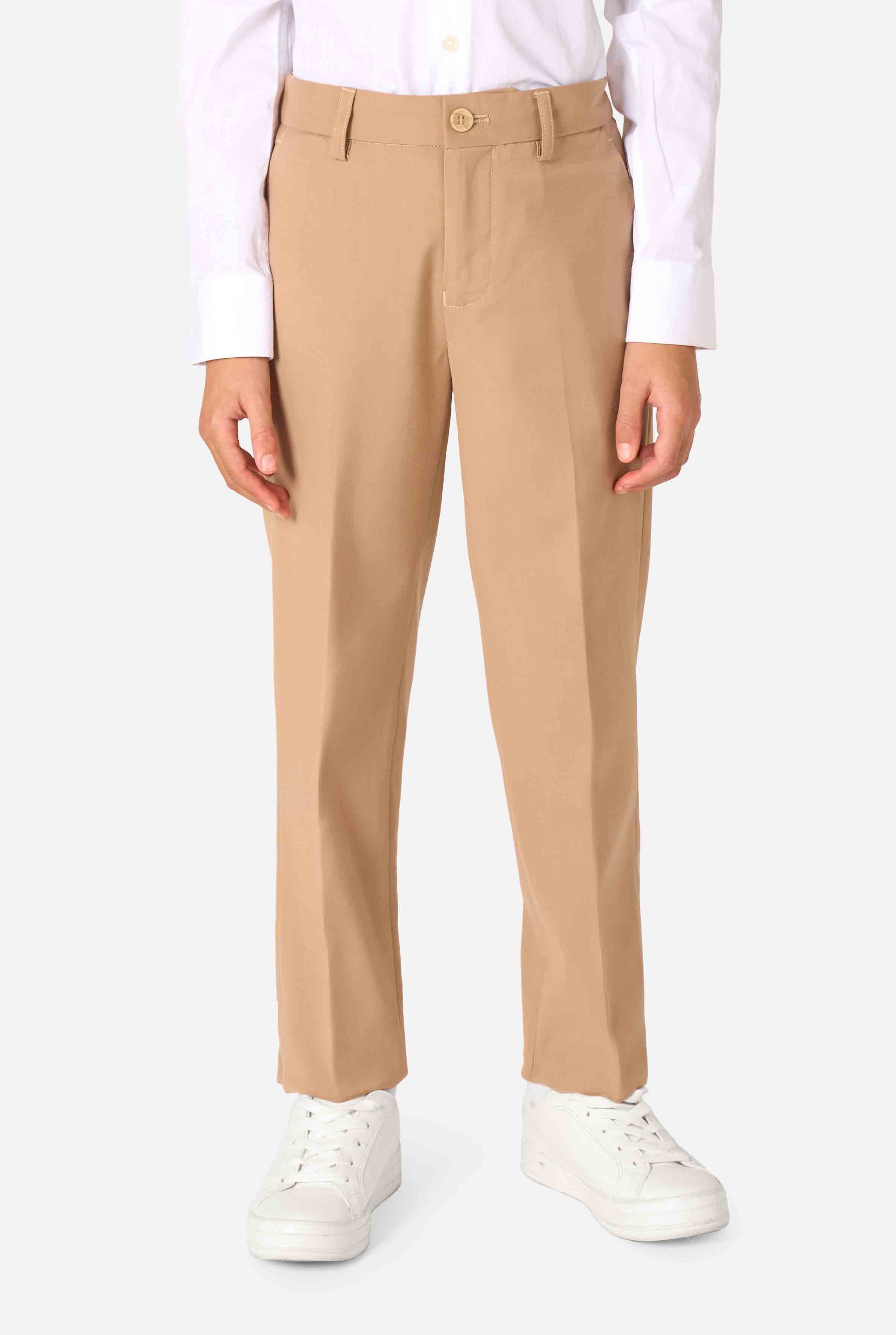 • Kid wearing a stylish light brown/ beige suit with a white dress shirt, looking away from the camera. Perfect formal outfit for boys' special occasions, weddings, and parties. Focused on the pants.