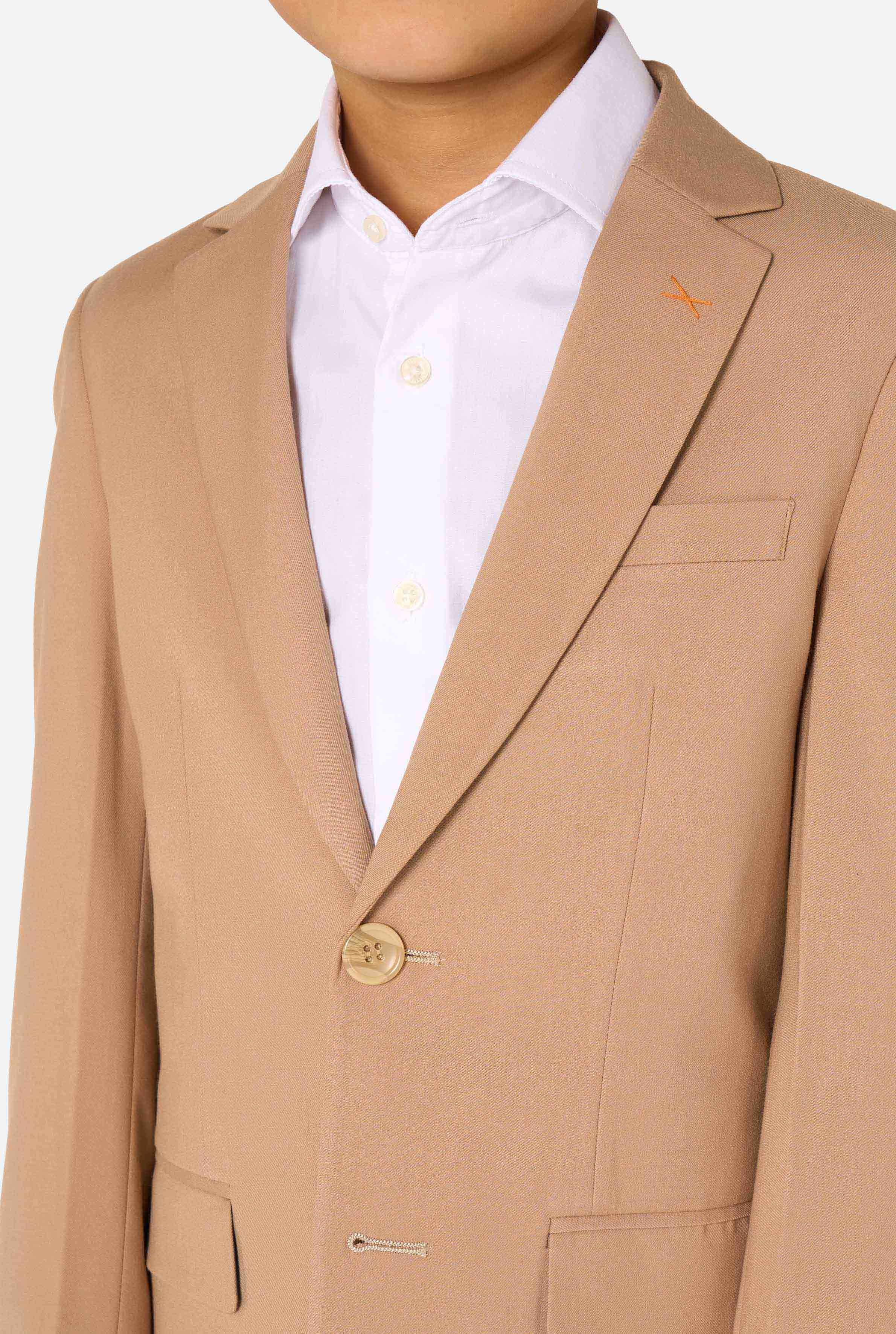 • Kid wearing a stylish light brown/ beige suit with a white dress shirt, looking away from the camera. Perfect formal outfit for boys' special occasions, weddings, and parties. Focused on the chest.