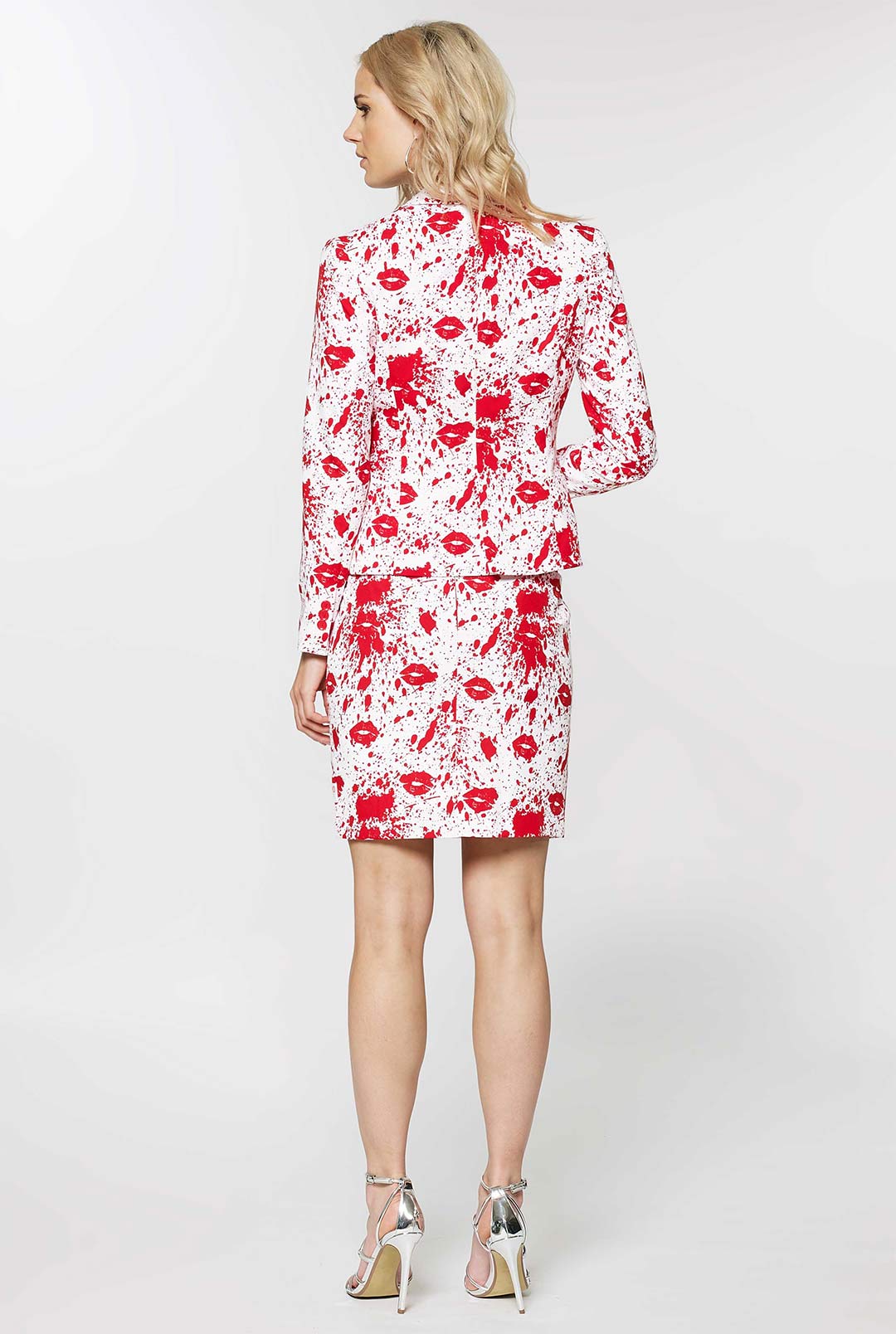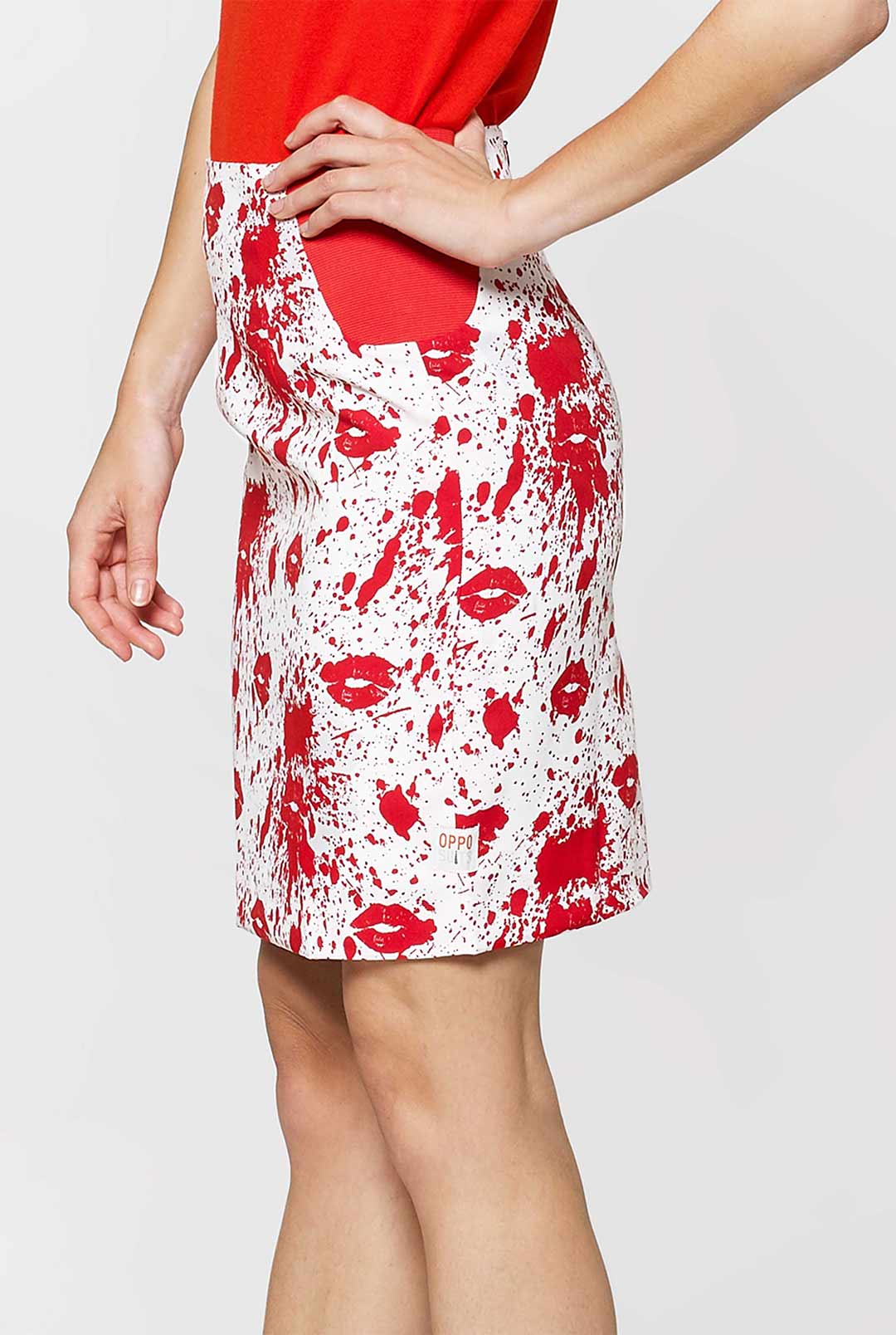 • Woman wearing white suit with red blood spatters