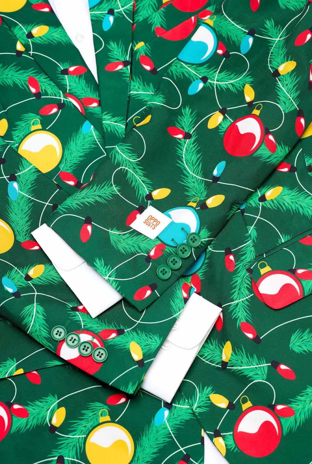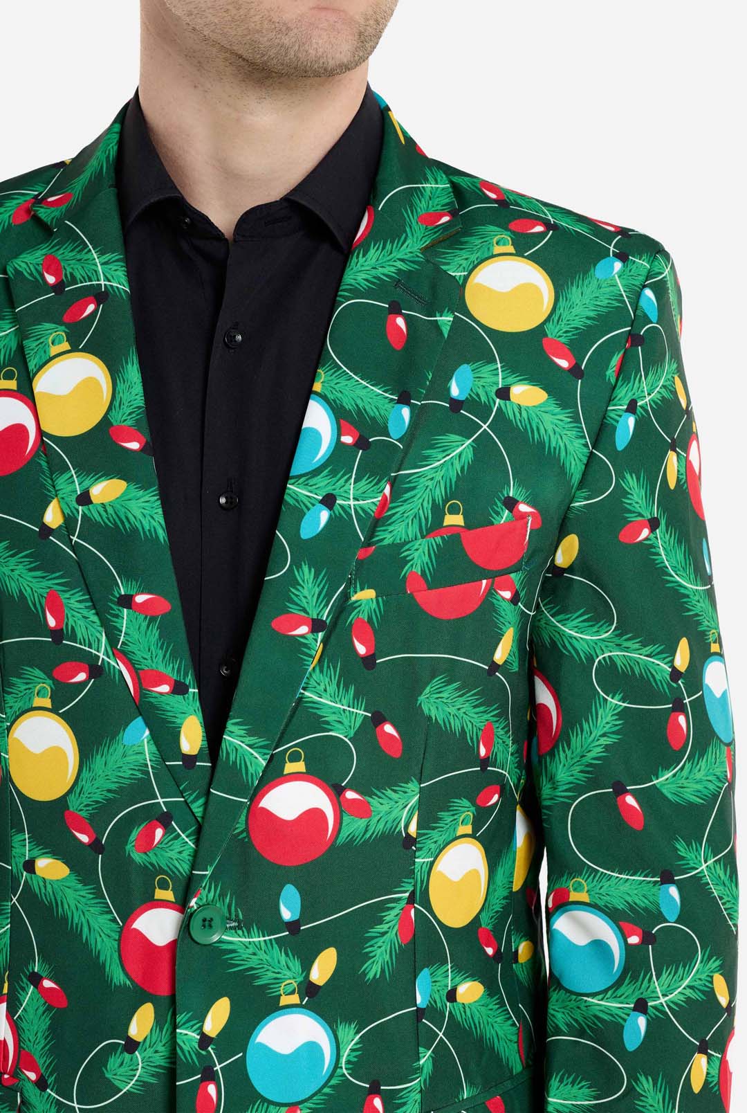 A bright and bold Christmas blazer featuring a lively tree-and-lights print that lights up the room.