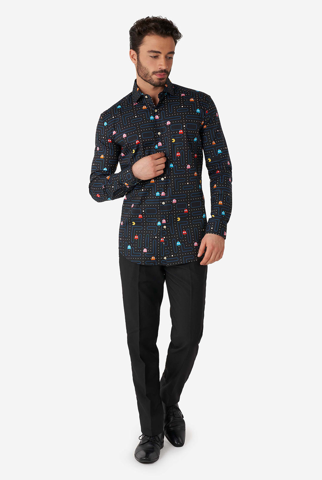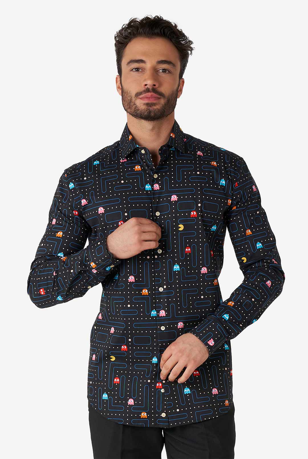 El traje PAC-MAN™ ahora está disponible como elegante camisa. ¿Te gustan los videojuegos retro? ¿Tus mayores enemigos son Inky, Blinky, Pinky y Clyde? ¿Son los píxeles redondos y amarillos tu comida favorita? ¡Estás de suerte, porque con esta camiseta oficial de manga larga con botones podrás demostrar una vez más tu amor por el arcade!