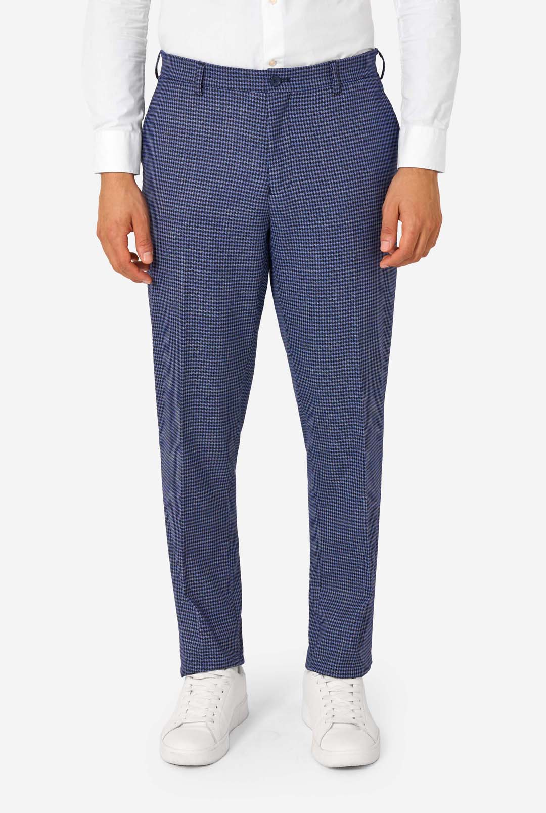 • A men wearing a navy and blue checkered suit with a white dress shirt. The suit has a modern fit with two buttons and flap pockets. He stands against a plain white background. Close up of the pants