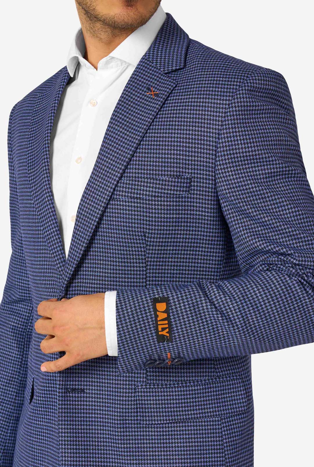 • A men wearing a navy and blue checkered suit with a white dress shirt. The suit has a modern fit with two buttons and flap pockets. He stands against a plain white background. Close up of the sleeves