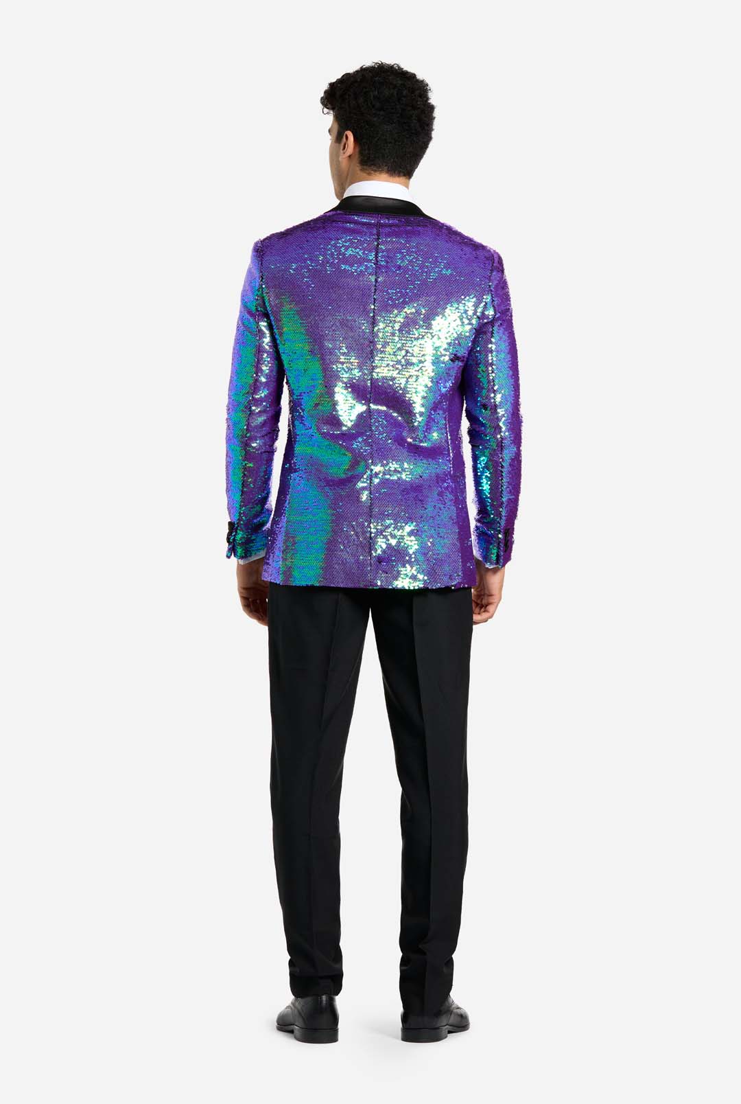 Unleash the royalty within with this eye-catching sequin Tuxedo. The Sapphire Sequins is for people who like to push it to limit and shine with striking sapphire blue colors. Featuring a sleek satin shawl lapel and paired with classic black pleated pants, this tuxedo strikes the perfect balance between sophistication, class and unmistakable flair.
