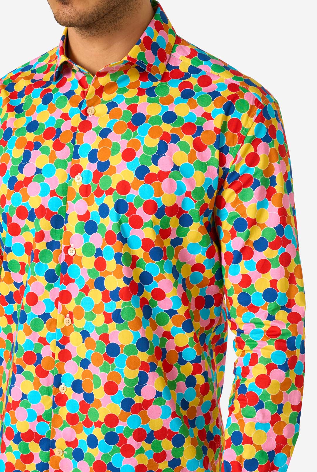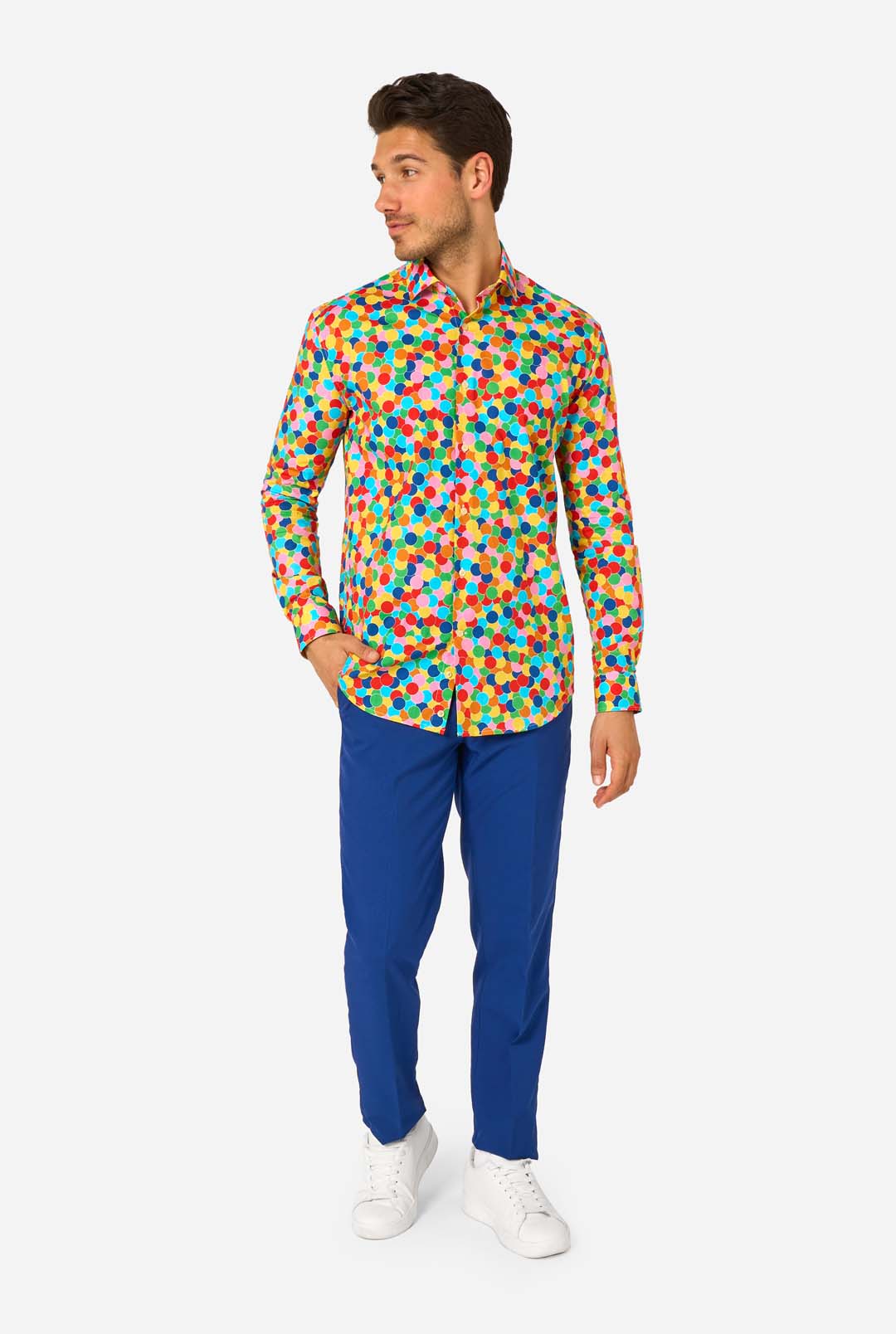 • Man wearing a colorful polka dot confetti shirt on a white background