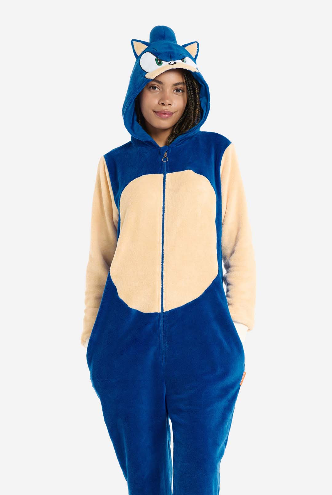 • A woman is dressed in a cozy, blue Sonic the Hedgehog adult onesie, featuring soft beige patches on the front and sleeves to replicate Sonic's iconic look. The onesie has a hood designed with Sonic's recognizable face, including large green eyes, blue spikes, and pointy ears. The front zipper closure ensures a comfortable fit, and the woman stands with her hands in the onesie's side pockets. Her expression is calm and relaxed. This Sonic the Hedgehog onesie is ideal for cosplay, lounging, or themed events.