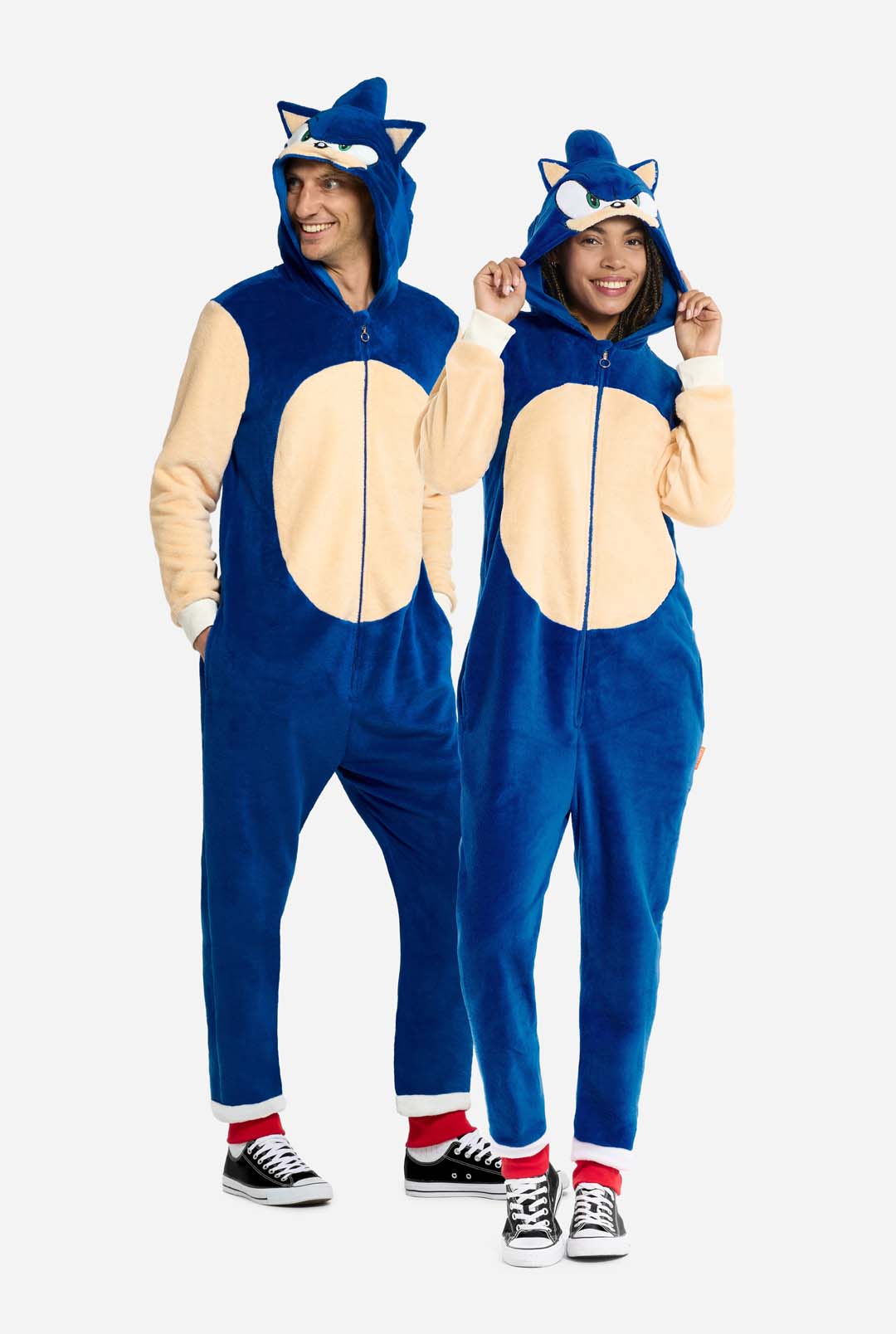 • A man and woman wearing a playful blue and beige Sonic the Hedgehog-themed adult onesie from OppoSuits. The cozy onesie features a zip-up front and an attached hood designed to resemble Sonic’s iconic face, complete with ears and an expressive gaze. The blue body of the suit contrasts with a beige belly, mimicking Sonic's classic look.