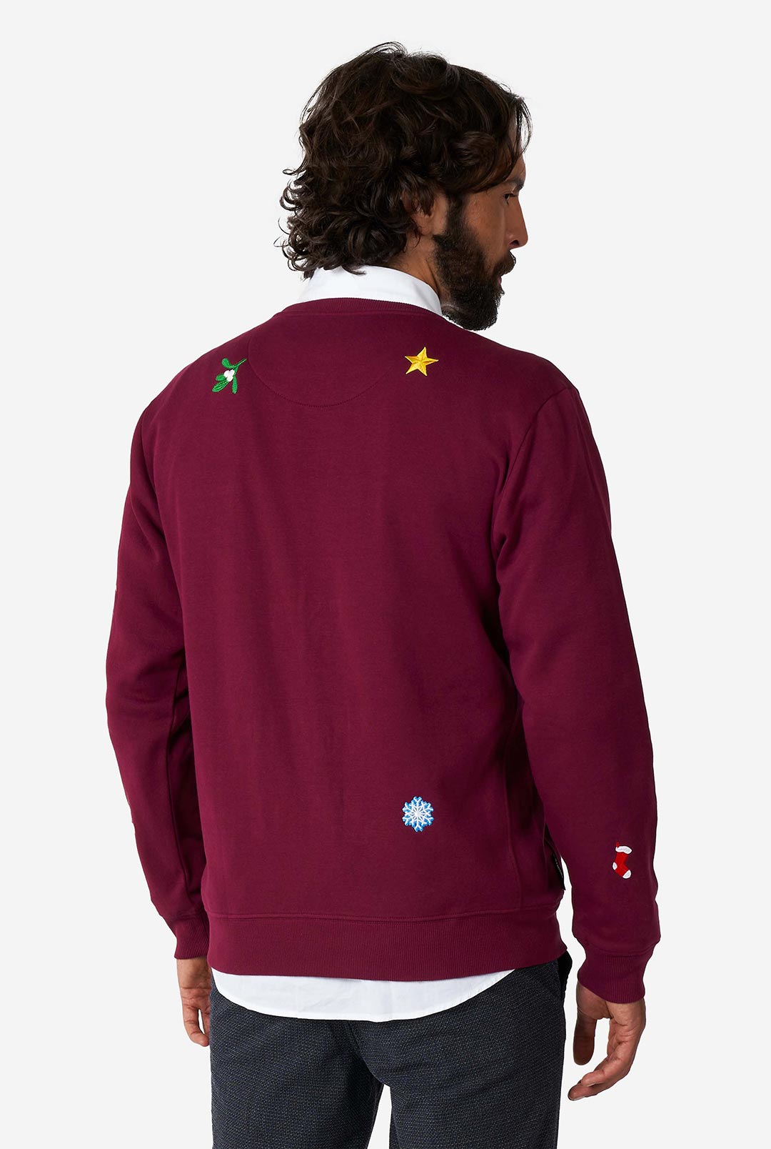 • Man wearing burgundy red Christmas sweater with Christmas icons